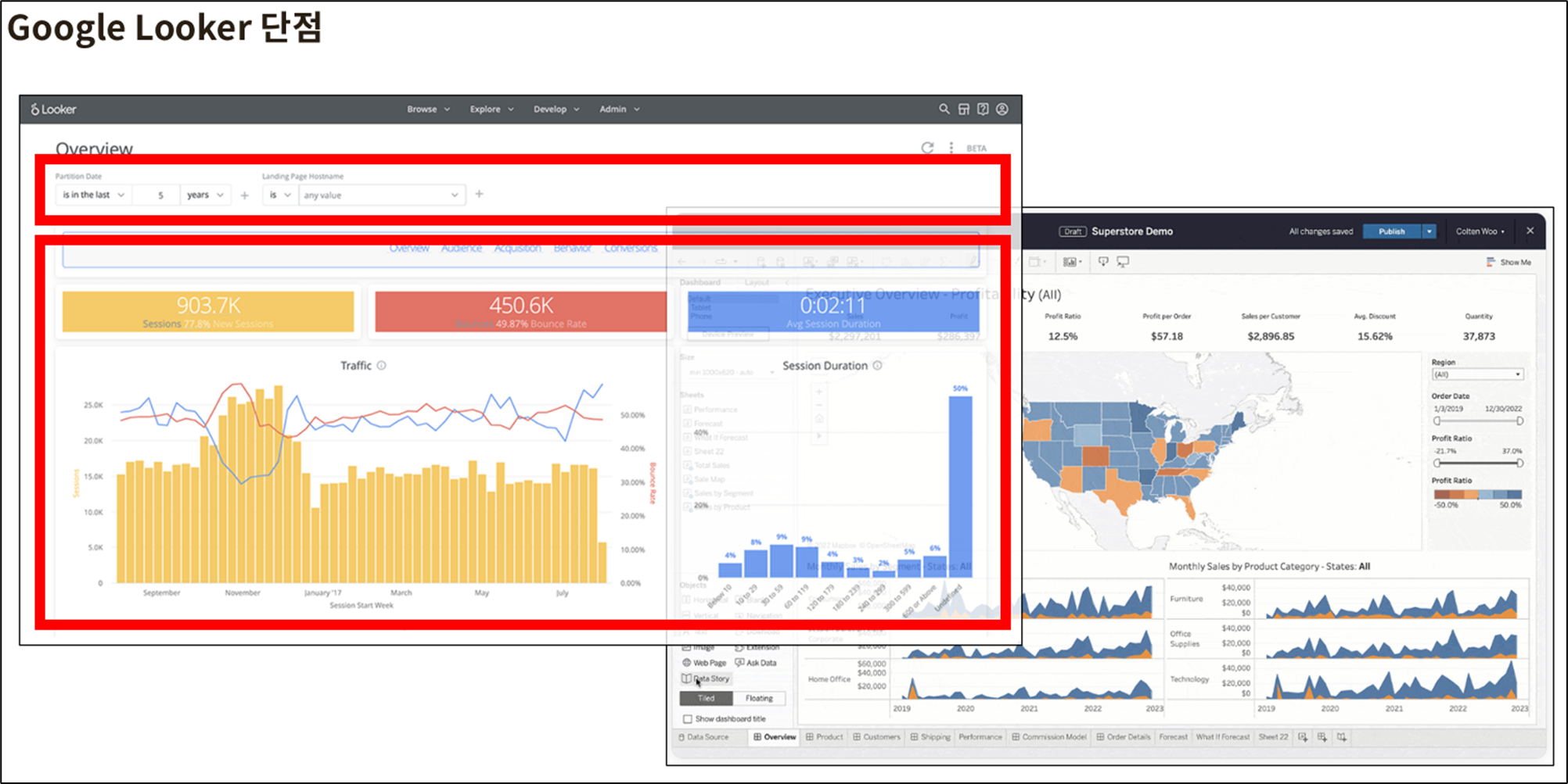 또.. Tableau는 상단 필터에서 조회하고, 화면 내의 객체에서 추가 이벤트로 정보를 조회할 수 있지만, Looker는 상단 필터만 가능합니다. 그리고 상단 필터와 그리드 같이 몇가지 기능은 크기 조절이나 색상 등 다른 BI툴에서 변경할 수 있는 그런 부분을 바꿀 수 없는 제약이 있습니다.